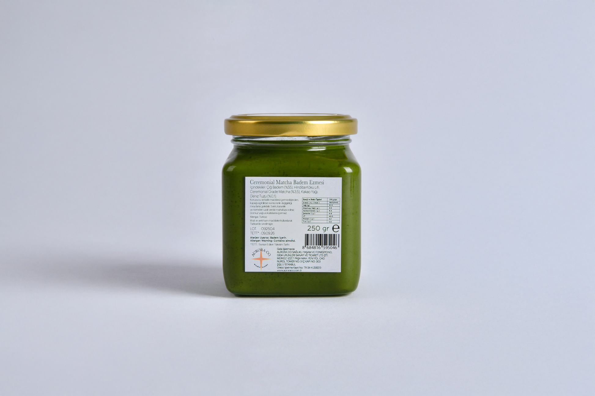 AuroraCo. olarak, badem ezmemizde en yüksek kaliteye sahip “Ceremonial Grade Matcha” kullanıyoruz. Piyasadaki çoğu markanın aksine mutfak sınıfı (Culinary Grade) matcha yerine, doğrudan seremonilerde kullanılan en saf ve kaliteli matcha’yı tercih ediyoruz.